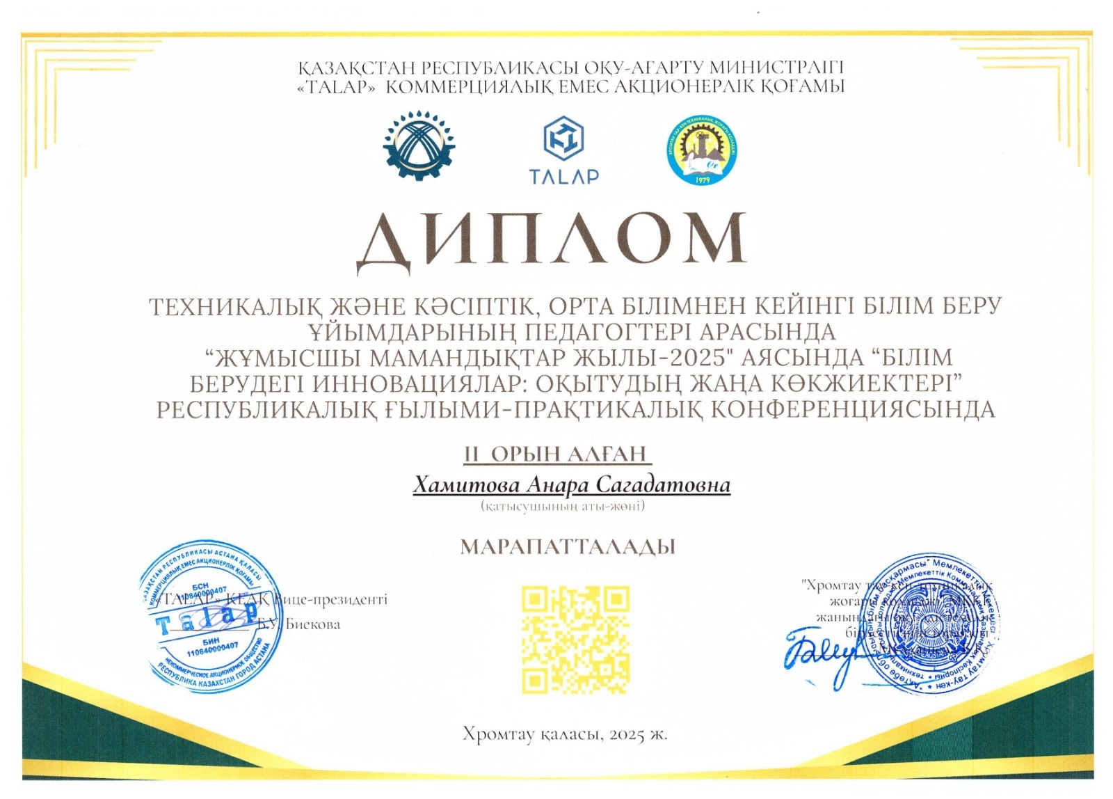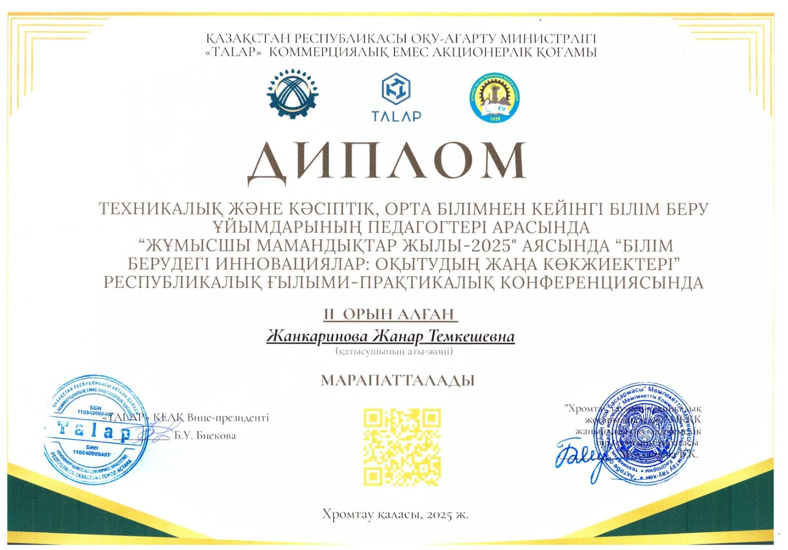 Стали призерами: 2 место Жанкаринова Ж.Т. преподаватель математики и информатики, 2 место Хамитова А.С. преподаватель английского языка в Республиканской научно-практической конференции по теме: «Инновации в образовании: новые горизонты обучения», в рамках Года рабочих профессий-2025. Организаторы конференции: НАО «Talap», Республиканское учебно-методическое объединение по профилям, на базе ГККП «Хромтауский горно - технический высший колледж», г. Хромтау.